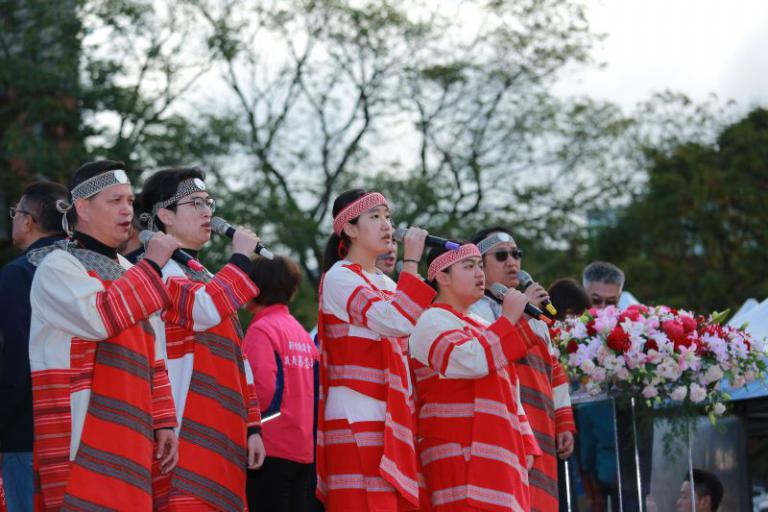 ▲泰雅之聲合唱團4名成員及2名學生擔任國歌、國旗歌領唱。(圖/記者蔣彤雲攝)