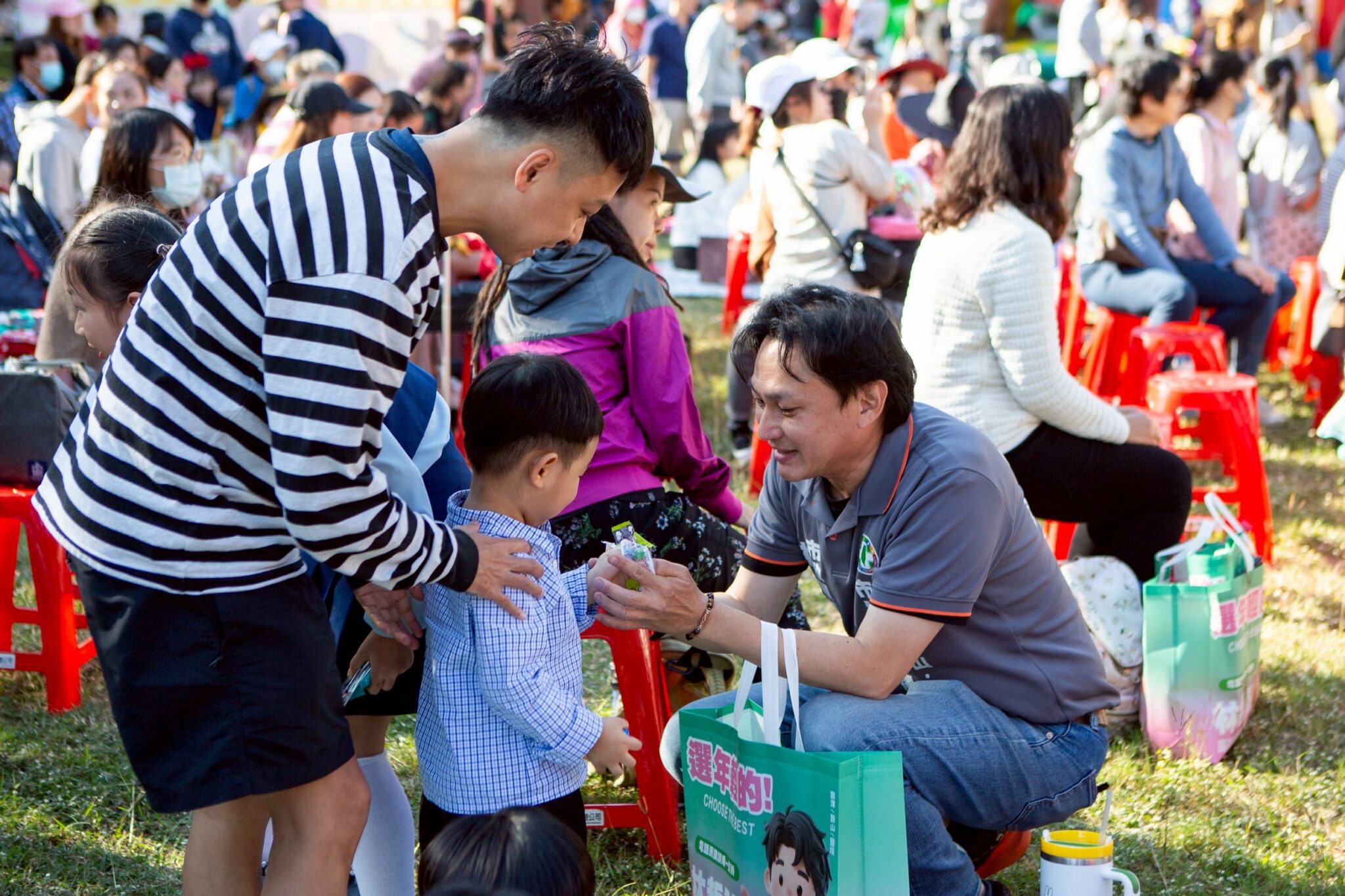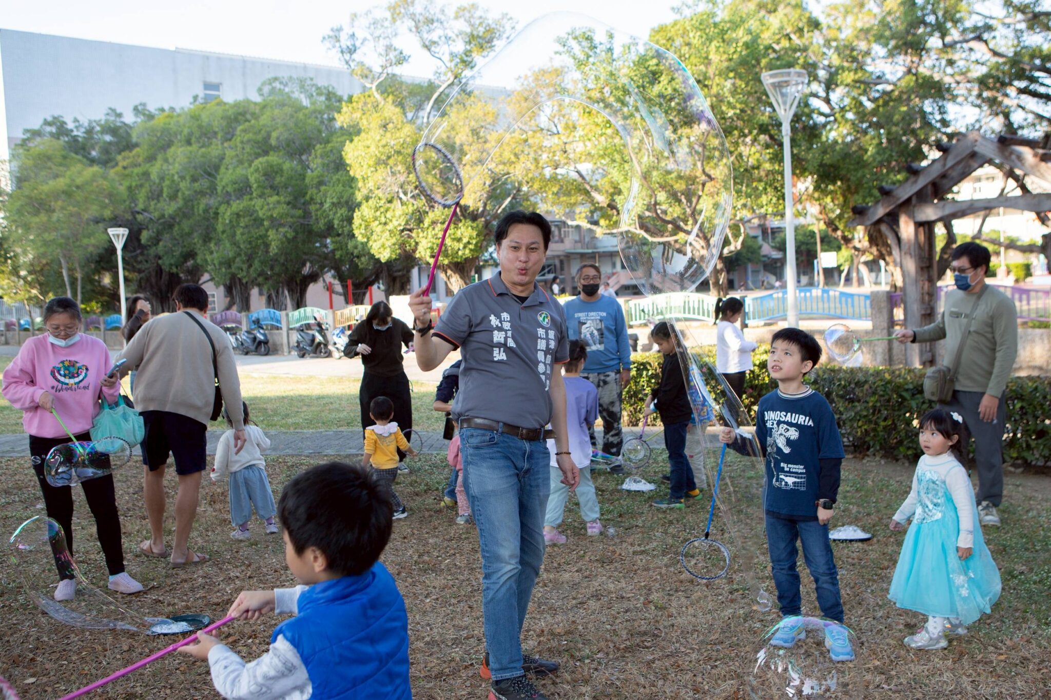 活動過程中,林哲弘也親自與孩子互動,發送氣球、陪玩泡泡、準備小禮物,笑聲不斷。現場另安排學生音樂演出、街頭藝人、泡泡派對、充氣城堡與義剪服務,讓親子能自在停留、共享草地時光。
