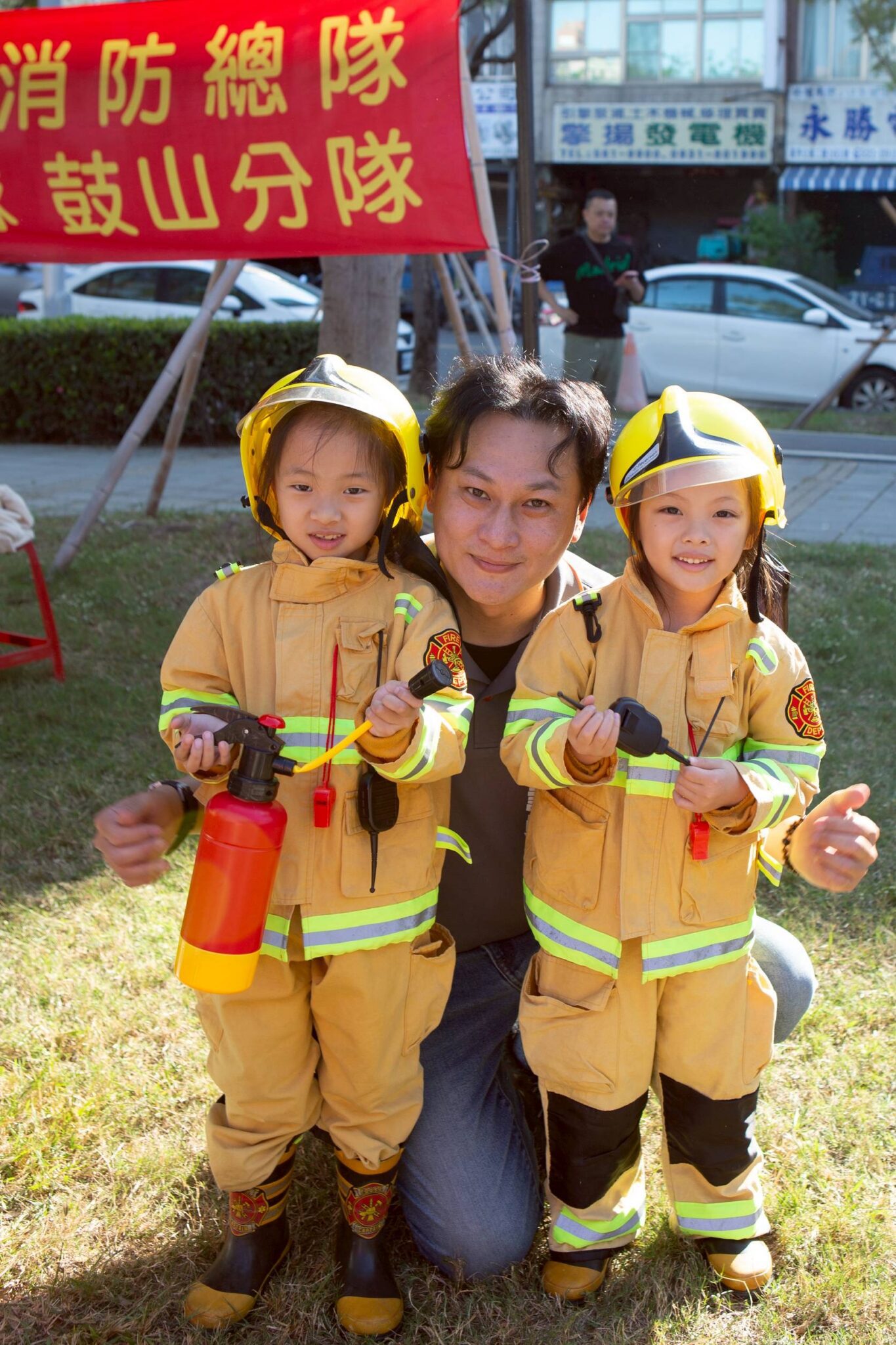 在「小小消防員體驗」區,消防人員現場解說消防衣帽與裝備用途,讓孩子實際感受消防員背負的重量與專業分工,進一步理解公共安全背後的付出,現場互動氣氛熱絡。