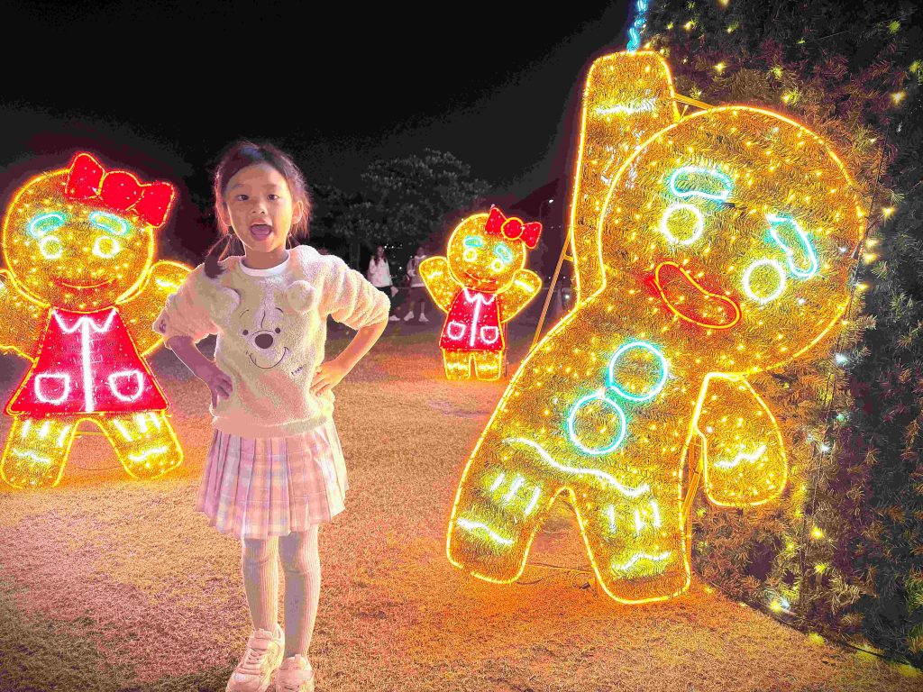 走進淡水捷運站後方的金色水岸,首先映入眼簾的是今年最具甜蜜氣息的主題燈區「光聚甜心時光」,以高達 8 公尺的聖誕樹為主角,搭配環繞周邊的薑餅人守衛隊光雕與繽紛暖色燈光,營造洋溢幸福感的節慶氛圍,成為情侶、親子與好友拍照打卡的熱門亮點。