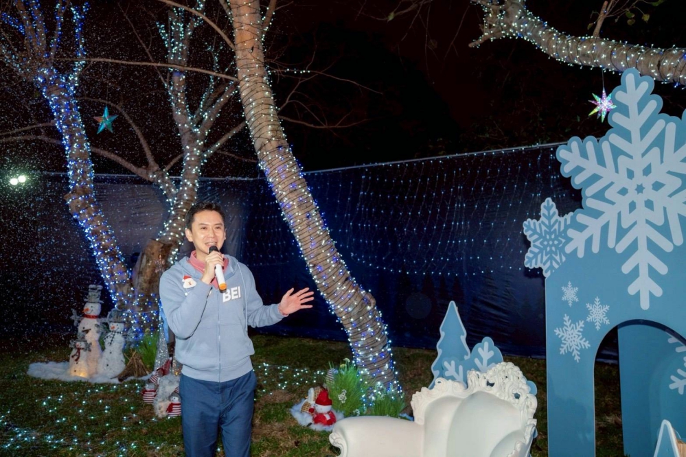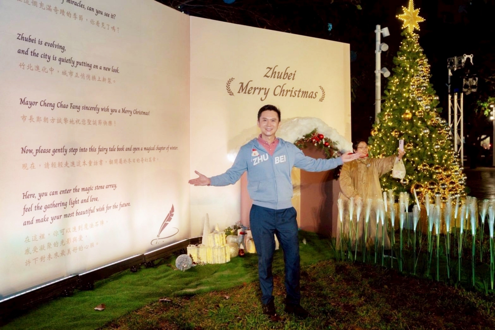 19日晚間啟動活動,由竹北市長鄭朝方、竹北市民代表會主席林啟賢、副主席葉信輝,以及多位市民代表、市場幹部共同出席,攜手點亮象徵童話想像的聖誕「魔法書屋」。在燈光亮起的瞬間,市東公園彷彿翻開故事書頁,光影與香氛泡泡在林間流轉,樹梢間點綴著萬丈星芒,步道、草地與裝置藝術相互呼應,處處藏著巧思與驚喜。營造出溫暖而夢幻的節慶氛圍,現場不少市民駐足拍照、驚喜連連,感受竹北夜晚難得一見的童話時刻。