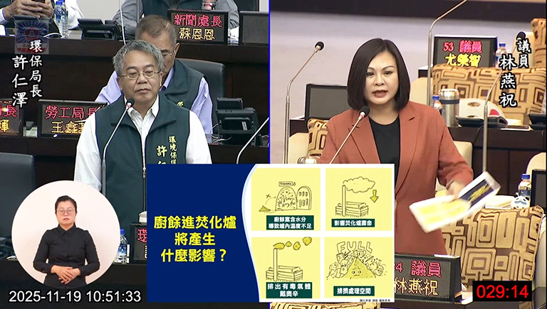 林燕祝說,中央全面禁止廚餘養豬後,造成廚餘之亂,台南每日要去化的廚餘就高達100噸,焚化爐就必須要燒大量的廚餘,會產生許多問題,因廚餘富含水分會導致爐內溫度不足,影響焚化爐壽命,現又正值永康焚化爐的歲修期,僅剩城西焚化廠在運作,也排擠了處理民生垃圾的量能,她更憂心的是燃燒廚餘會產生大量的戴奧辛,不僅是隨風向飄散,戴奧辛也會沉降到土壤或地下水源,慢性毒害市民的健康,她認為,廚餘的去化是當務之急,建議市府盡快規劃蓋生質能源廠,將資源循環利用。