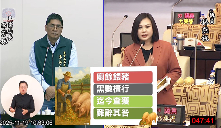 為防範非洲豬瘟疫情持續擴大,中央已公告自10月22日起全面禁止使用廚餘養豬,林燕祝踢爆有業者至今仍是違反禁令,從她秀出的照片和影片中可以清楚看到殘破的豬舍裡桶中滿滿的熟廚餘,環境髒亂不堪,豬舍周圍堆放許多非法棄置的營建混合物和瀝青,民眾已多次檢舉遭漠視,直到她收到陳情協助才開始有積極作為,且這個的養豬場也未取得畜牧場登記或飼養登記證,主管機關沒辦法對其撤證,到底全市還有多少廚餘養豬橫行的黑數,她要求市府相關單位應落實稽查並從嚴裁罰,不要放任業者的犯行,成為防疫的破口。