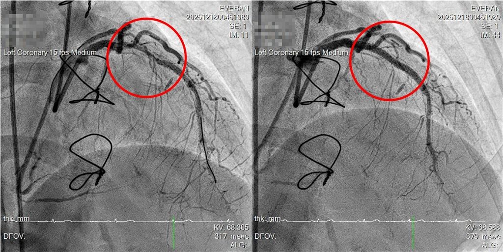 回顧病史,李小姐多年前即接受過冠狀動脈藥物支架治療,四年前因再次狹窄於他院接受心導管介入,惟效果有限,最終改以外科繞道手術處理。未料繞道血管後續仍發生阻塞,使心臟灌流再度仰賴原本已高度病變的冠狀動脈,形成結構複雜且風險較高的臨床情境。