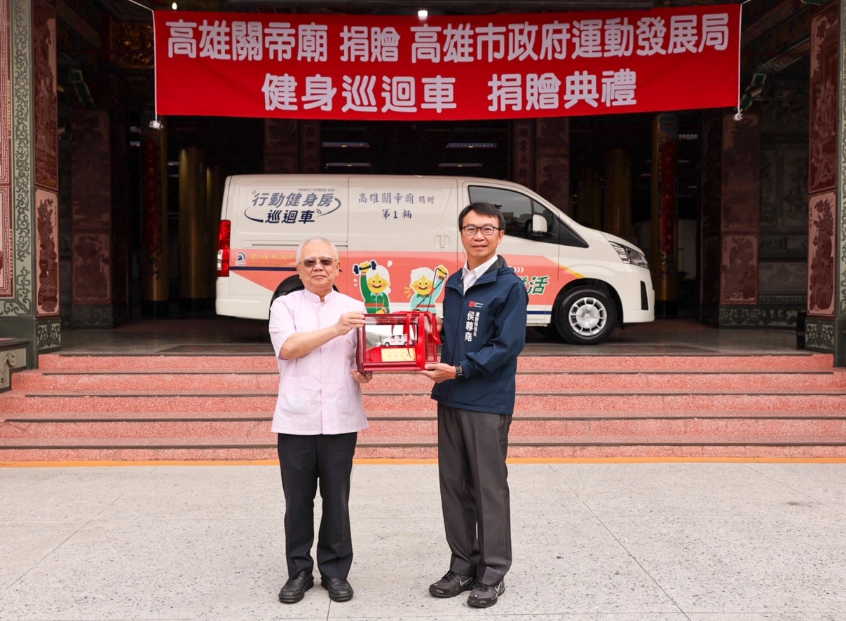 【焦點時報/記者蔡宗憲報導】為持續推動高雄市銀髮族健康促進政策,高雄關帝廟於114年12月24日上午舉行捐贈儀式,捐贈高雄市政府運動發展局「行動健身房巡迴車」1輛及健身器材1批。儀式由運動發展局侯尊堯局長代表受贈,並回贈感謝狀及獎座表達謝意,展現關帝廟回饋社會、關懷長者健康的公益精神。