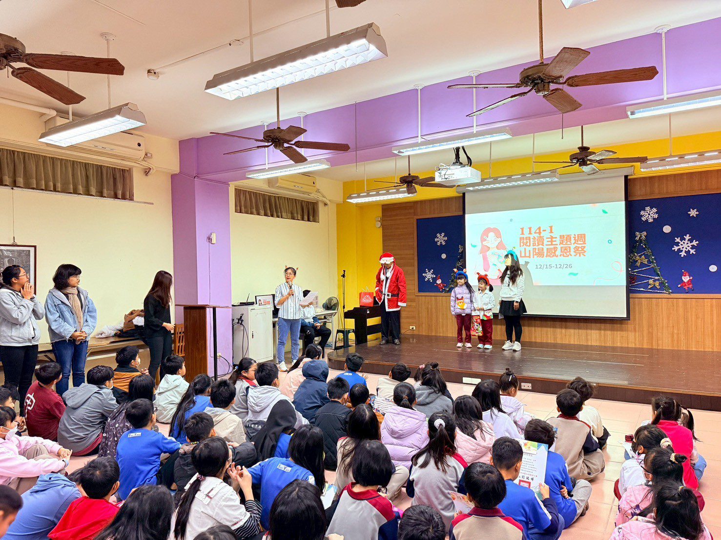 大里區塗城國小辦理「耶誕傳情・書香致謝」引導學生書寫感恩卡並製作耶誕造型角書籤,將祝福與閱讀樂趣巧妙結合;南屯區文山國小以「耶誕感恩」主題書展結合跨領域學習,透過座標塗色融合數學與藝術,並由故事志工改編繪本進行台英雙語戲劇展演,增添閱讀樂趣。大肚區山陽國小則辦理「山陽感恩祭」,校長、愛心媽媽志工與學生攜手演出「山陽小劇場」,以生動情境呈現互助與感恩情節,為閱讀推動活動揭開溫馨序幕。