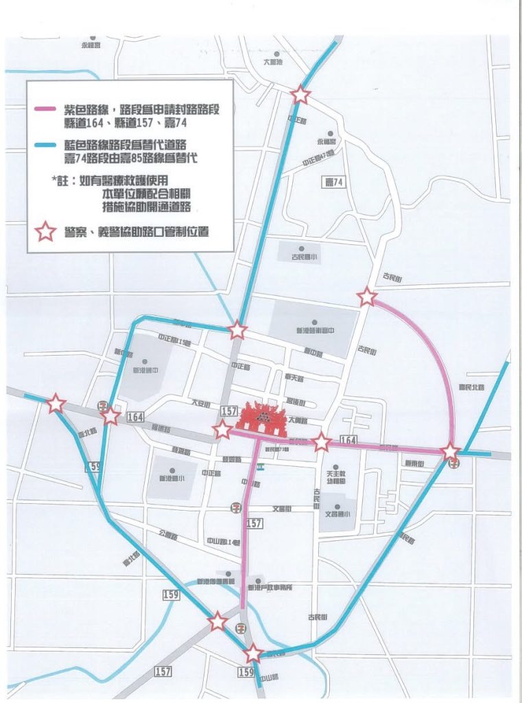 嘉義縣新港奉天宮舉辦「2025跑出金虎爺全國路跑賽」活動,本次參賽選手將有6279人,為避免新港奉天宮前廣場及新港鄉中山路段大量車流湧入市區街道造成危險,訂於114年11月22日(星期六)下午2時至114年11月23日(星期日)12時止,針對奉天宮周邊道路規劃交通疏導管制及替代路線如下: