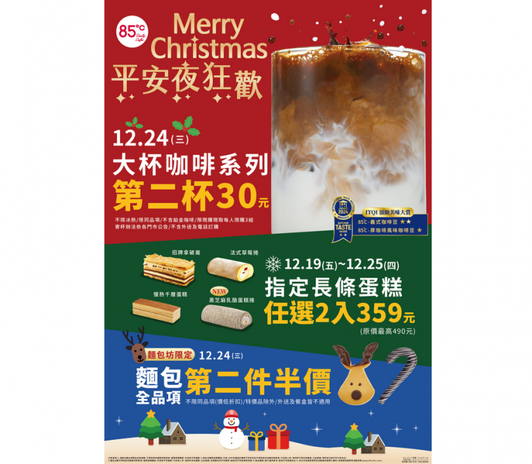 85℃狂歡平安夜活動12月19日到12月25日,指定長條蛋糕任選兩條,12月24日平安夜當天,全台門市還有大杯咖啡系列不限冰熱第二杯特價,當天85℃麵包坊全品項麵包第二件半價,想省荷包千萬不要錯過年末強檔優惠,錯過要再等一年喔!