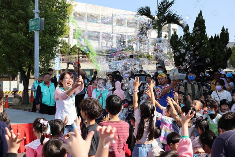 ▲活動除了馬路塗鴉,還安排有魔術秀、泡泡秀還有氣墊遊樂設施,大小朋友宛如置身遊樂園。(圖╱黃秀芳競總提供)