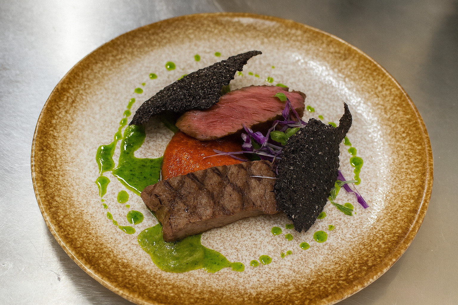 宜蘭牛排推薦《豬露食事》哈里薩風味烤牛排與紫米脆片,展現主廚創意風格的西式擺盤(圖/Medick Marketing Ltd.提供)