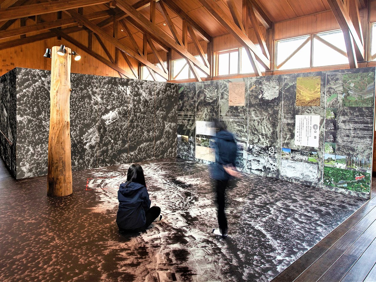 沼平火車站二樓室內展區則設置「從森林到森林」平面及影像展示,展示地板與牆面上印製比例1:100的1963年沼平地區空照圖,讓民眾能對應現況,認識沼平舊聚落規模、聚落與車站及工業空間之間的關係;「回聲」聲音裝置傳遞歷史,藉由訪談曾經居住在沼平聚落的15位住戶,將其訪談口述整理成「回聲」聲音裝置,透過居民述說親身經歷的過往,讓後人能試圖描繪聚落的樣貌。